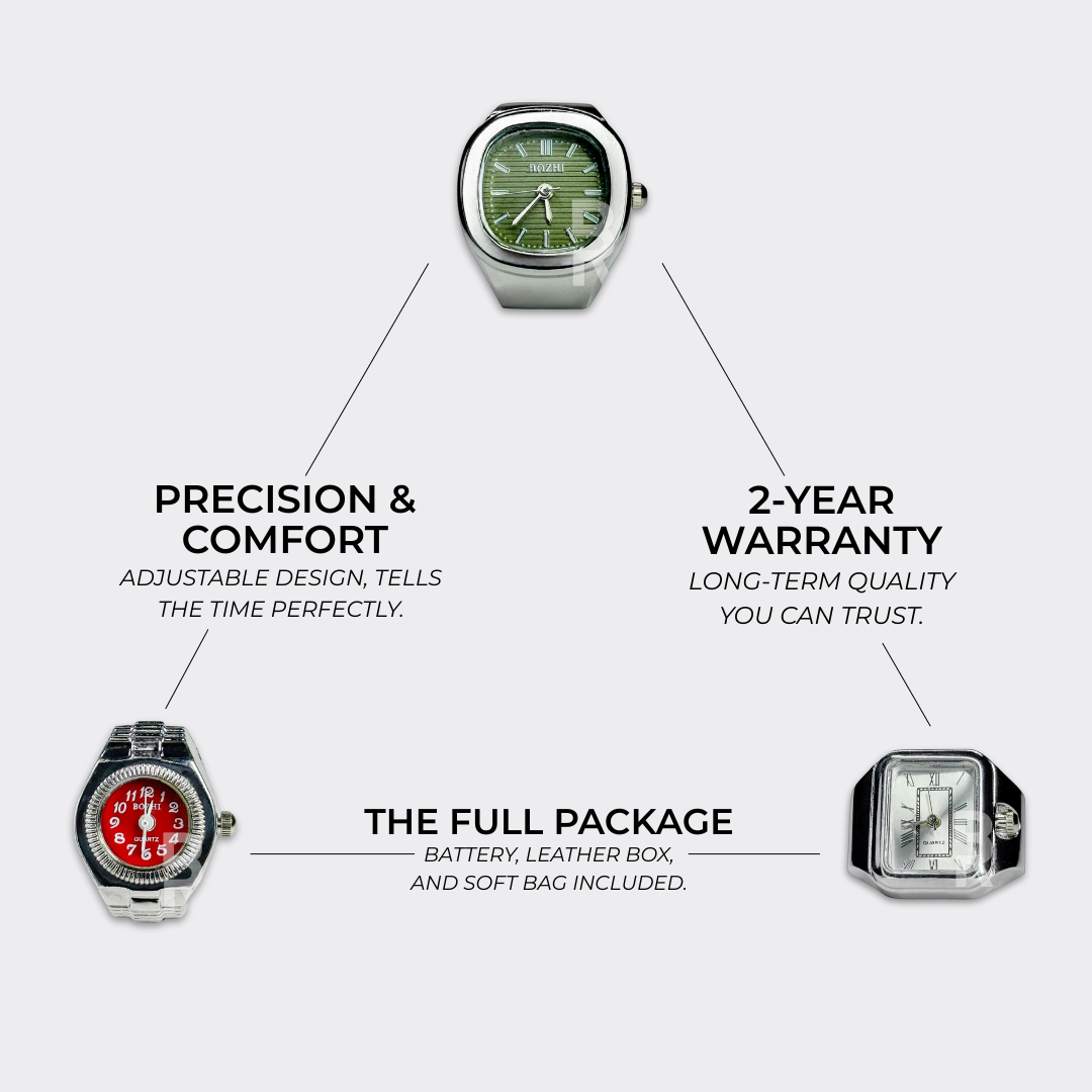 The Bozhi Ring Watch is a stylish unisex accessory designed in Milan, crafted from a durable zinc alloy and metal blend. It merges functionality with chic design, offering a unique and contemporary take on personal fashion accessories. Our rings have only one size. They are adjustable to any finger.