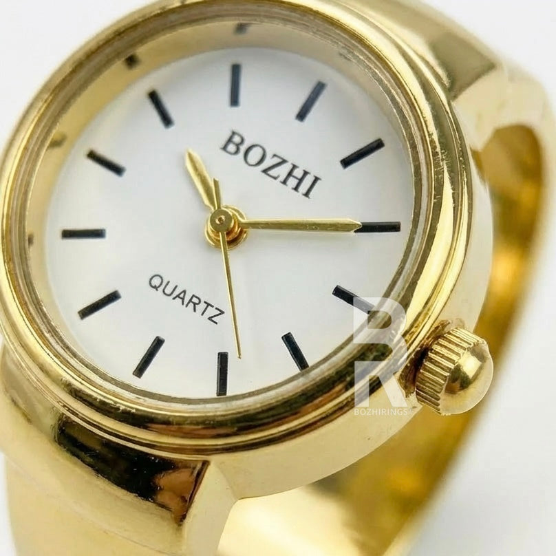 The Bozhi Ring Watch is a stylish unisex accessory designed in Milan, crafted from a durable zinc alloy and metal blend. It merges functionality with chic design, offering a unique and contemporary take on personal fashion accessories. Our rings have only one size. They are adjustable to any finger.