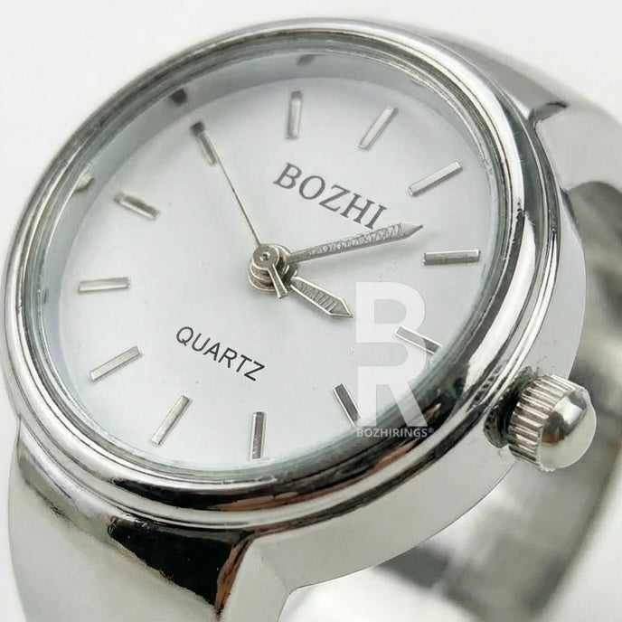 The Bozhi Ring Watch is a stylish unisex accessory designed in Milan, crafted from a durable zinc alloy and metal blend. It merges functionality with chic design, offering a unique and contemporary take on personal fashion accessories. Our rings have only one size. They are adjustable to any finger.